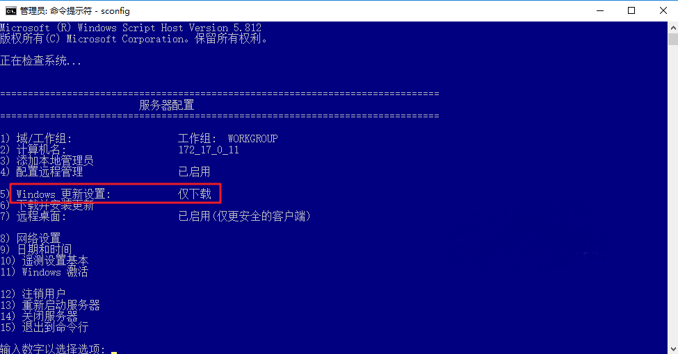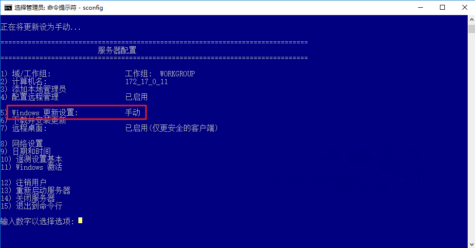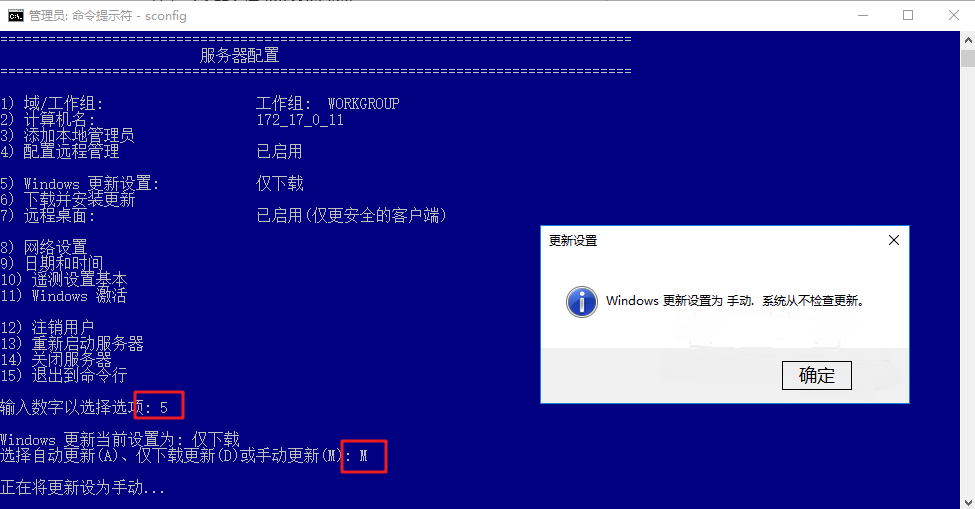2.看一看检查一下 5 后面的选项,也就是 Windows 更新设置(英文为:Windows Update Settings)后面的选项,如果不是手动(Manually),那么我们输入 5,然后回车,回车之后再输入 M,然后再次回车,即可修改为手动更新,这样就关闭了自动更新了,Windows 不会自动更新,也不会自动下载更新,只有我们手动检查更新的时候才会进行更新检查。